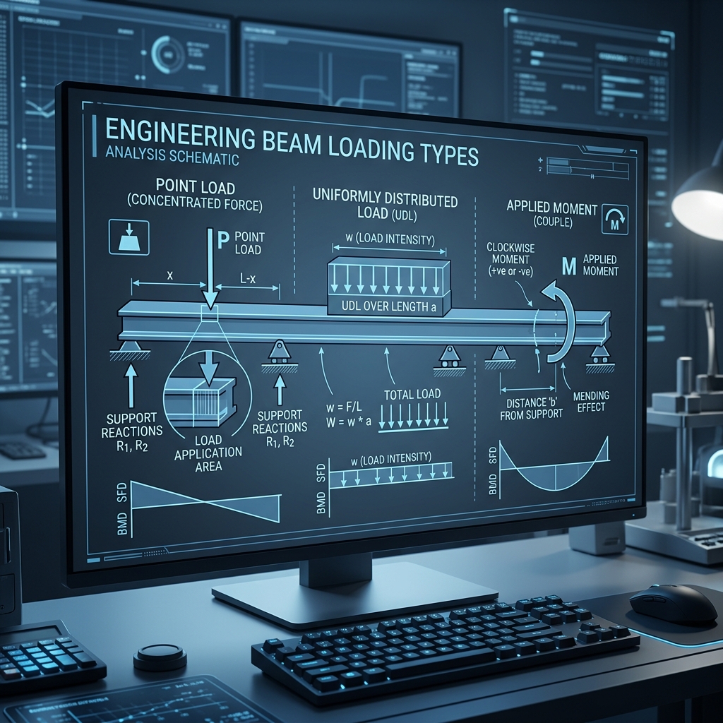 Differentiating between Point Loads, Uniformly Distributed Loads (UDL), and Moment applications on structural spans.