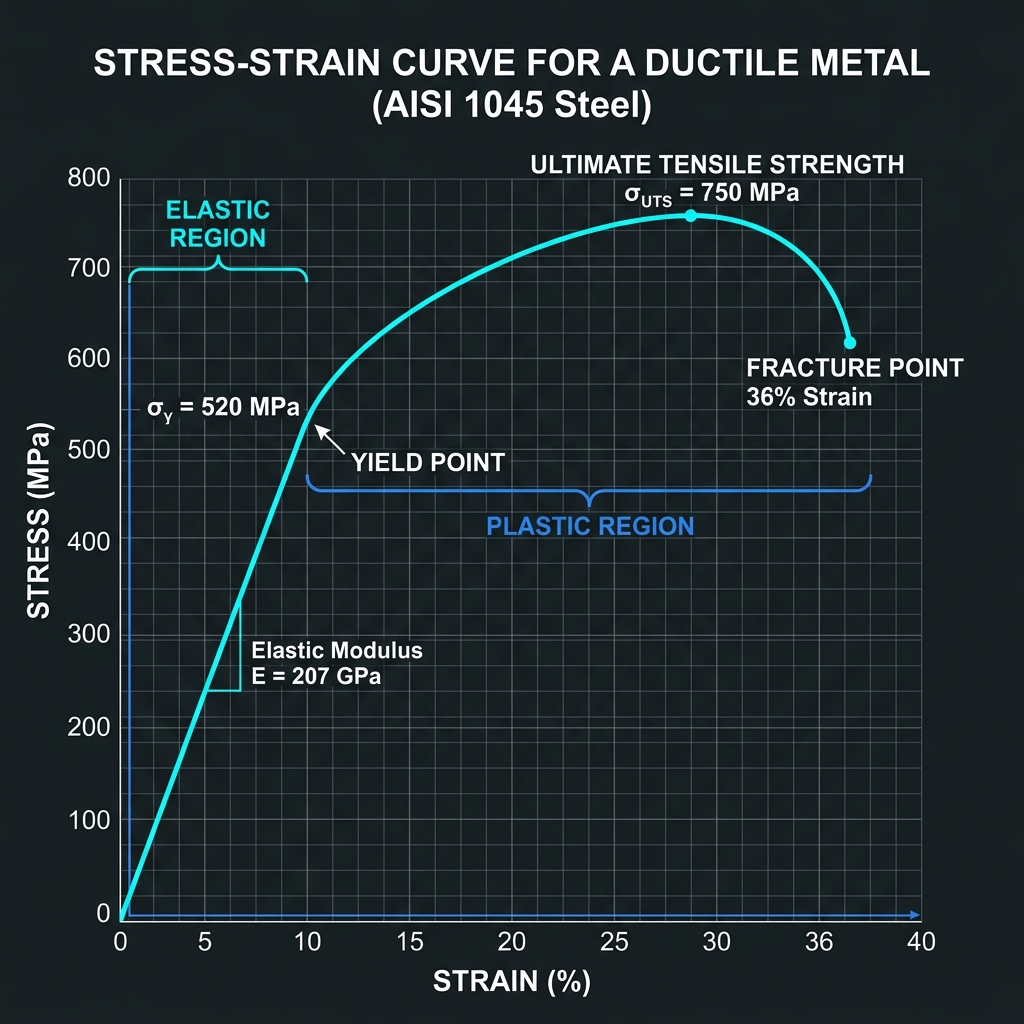 Understanding how materials deform under load. Key regions: Elastic Limit, Yield Point, and Strain Hardening.
